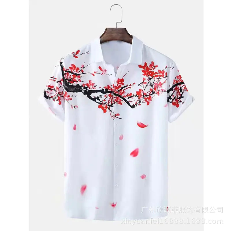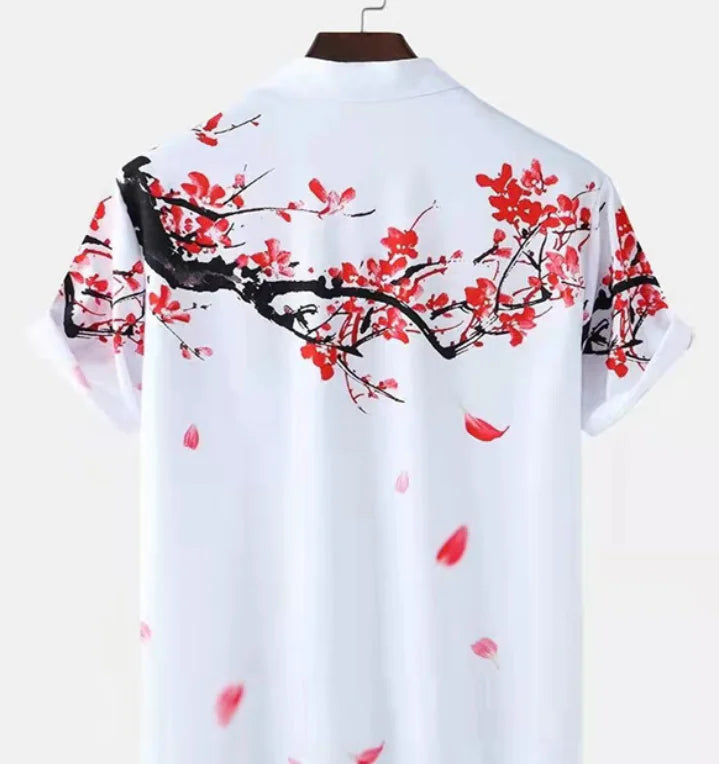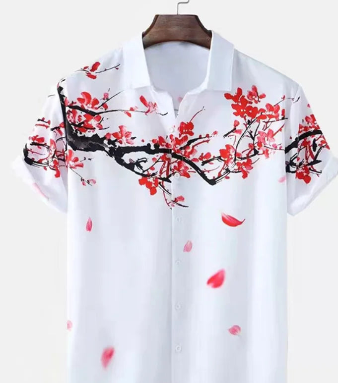 Embrace island vibes with this white short-sleeve Hawaiian shirt featuring a bold red Sakura cherry blossom print. Perfect for summer vacations and casual style.