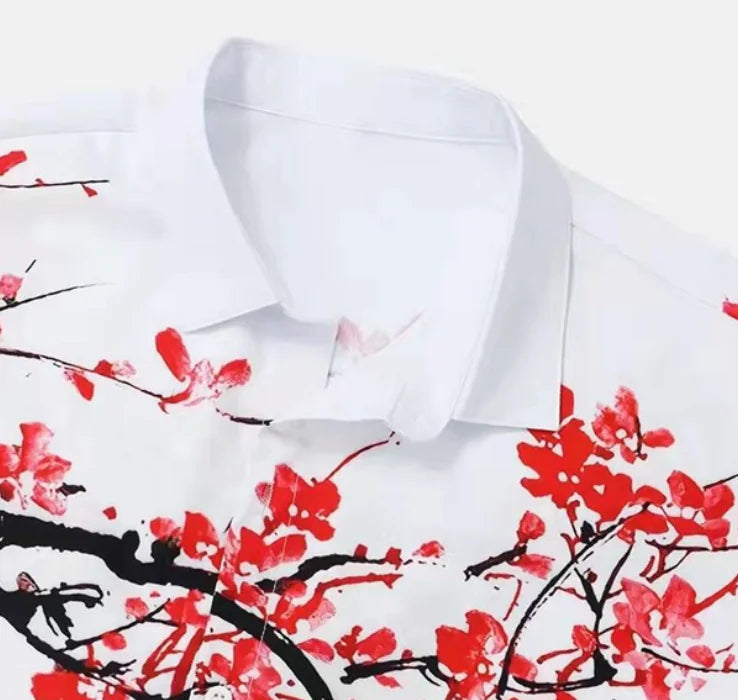 This striking button-down showcases a crisp white canvas adorned with a dramatic, horizontal branch of vibrant red Sakura blossoms. The artistic print features falling petals and delicate ink-style brushwork, creating a 3D visual effect that stands out from standard patterns. Crafted from a lightweight, breathable fabric blend, this shirt is designed with a relaxed camp collar and a straight hem, making it an ideal companion for beach weddings, tropical getaways, or elevated casual weekend wear.
