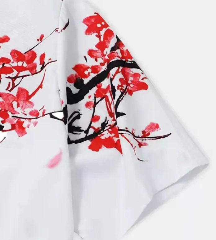 ⛩️ Artistic Sakura Print: A bold, "Ukiyo-e" inspired cherry blossom branch design that wraps across the chest and sleeves for a unique statement look.