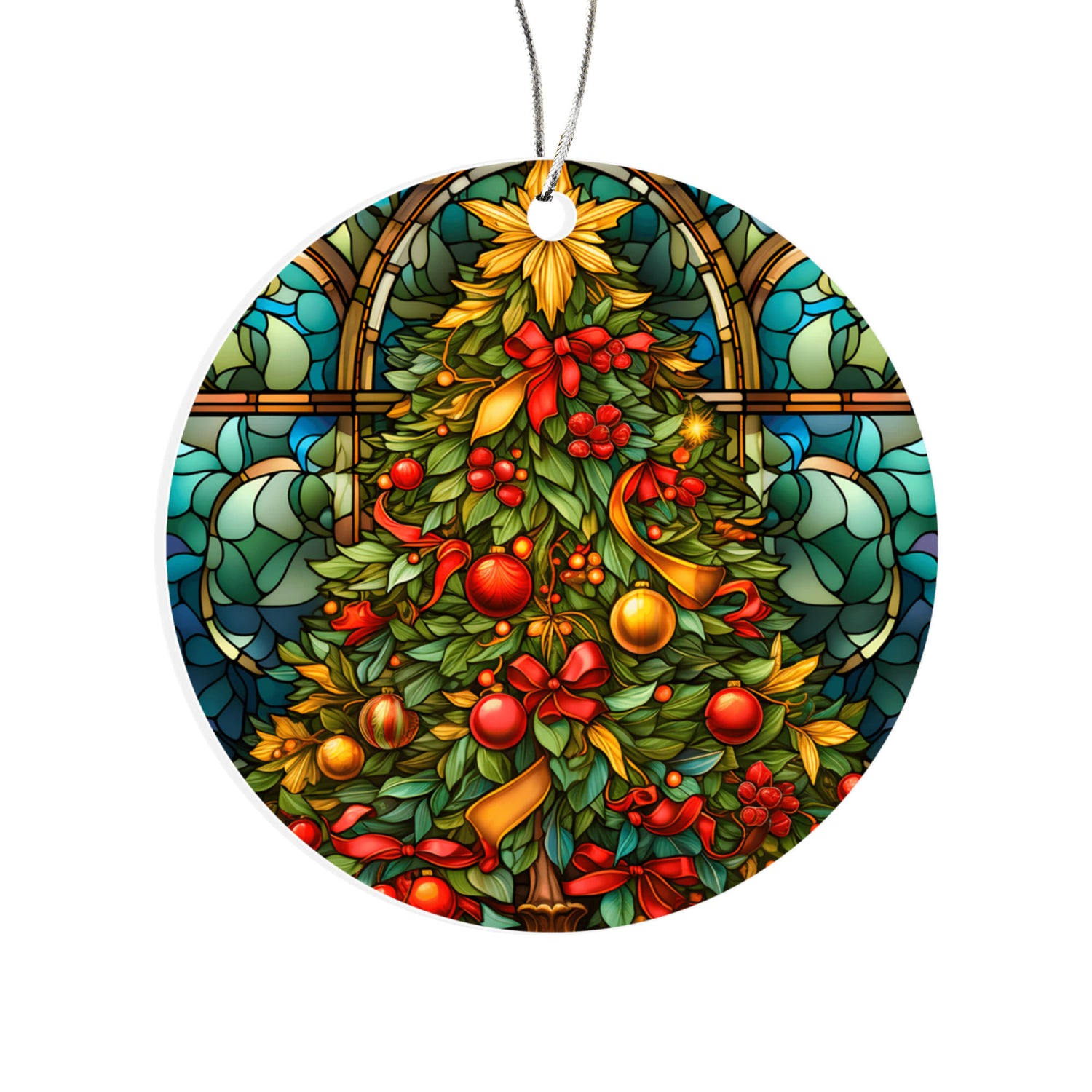 Vibrant flat acrylic ornament with a detailed stained glass effect. Features a richly decorated Christmas tree with red, gold, and green.