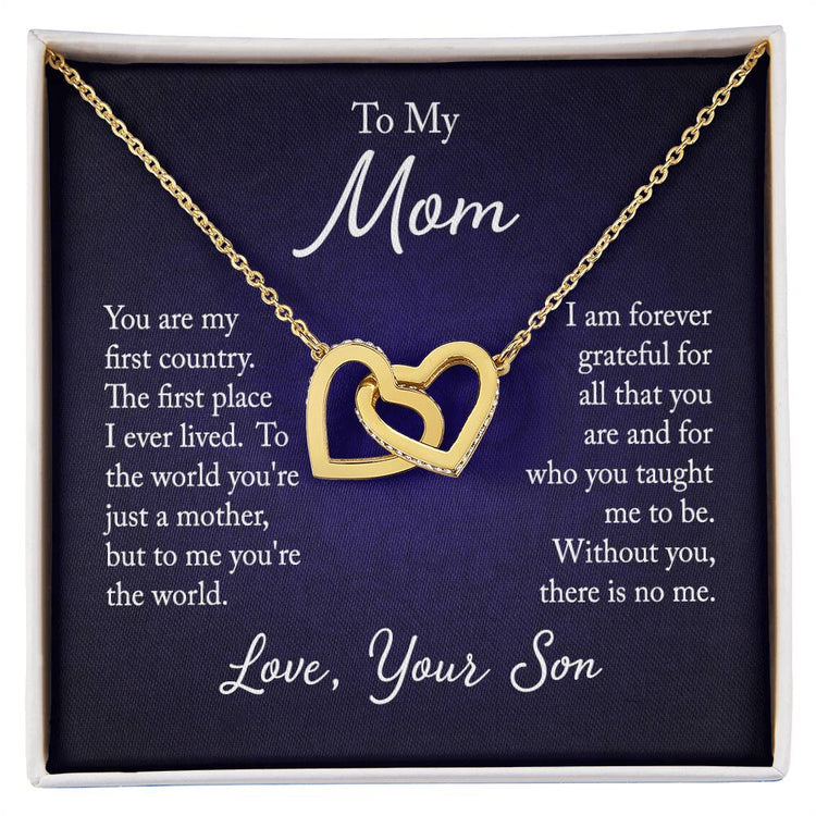 Show her she’s your world with this Interlocking Hearts Necklace – For Mom From Son. The two linked hearts symbolize your unbreakable bond—one silver-tone, one rose-gold-tone—for a timeless look she can wear every day. Nestled on a “To My Mom” message card and packaged in a ready-to-gift box, it’s a keepsake that says everything you feel.