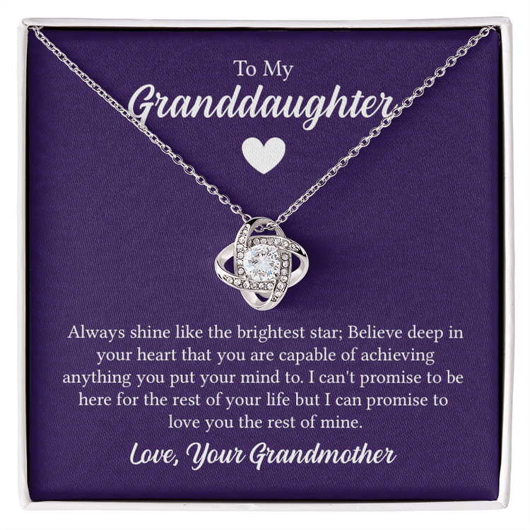 Wrap your love around her with this Love Knot Necklace for Granddaughter from Grandmother. The elegant knot—symbolizing the unbreakable bond between you—centers a brilliant crystal for timeless sparkle. Presented on a sentimental message card (“To My Granddaughter…”) inside a ready-to-gift box, it’s a keepsake she’ll treasure for years.