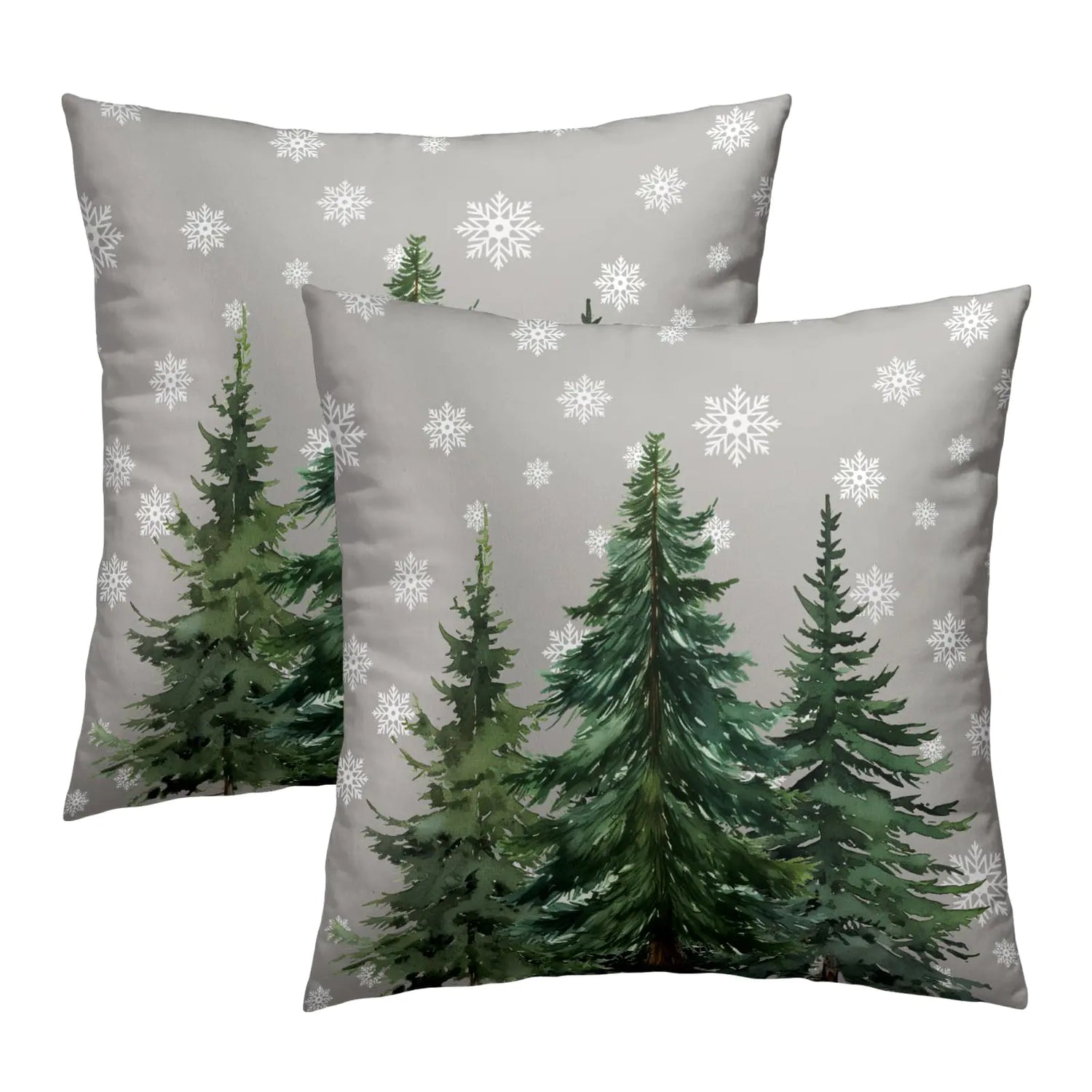 Create a cozy Christmas scene with this set of 2 pillow covers. Features a watercolor pine forest and snowflakes on soft grey cotton. Perfect for farmhouse winter decor.