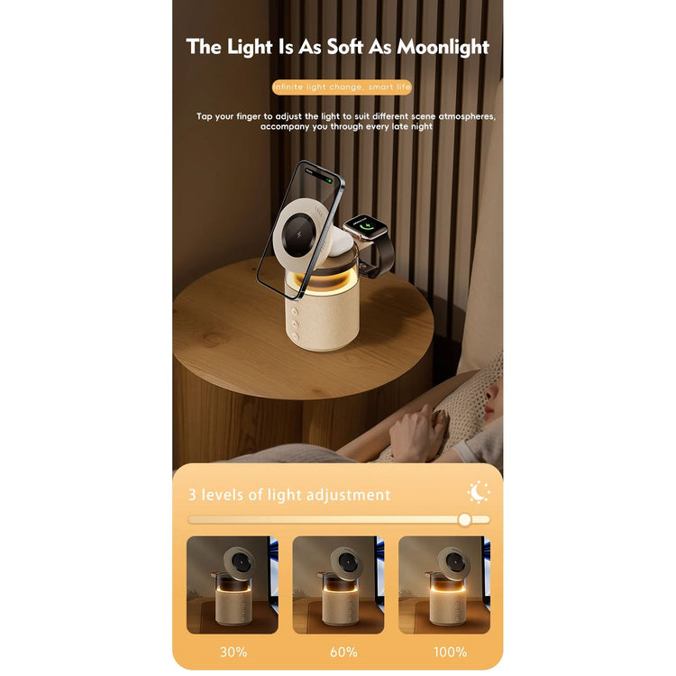 Upgrade your setup with the 5-in-1 Wireless Charging Station with Bluetooth Speaker and Night Light — a multifunctional all-in-one hub designed to simplify your life.