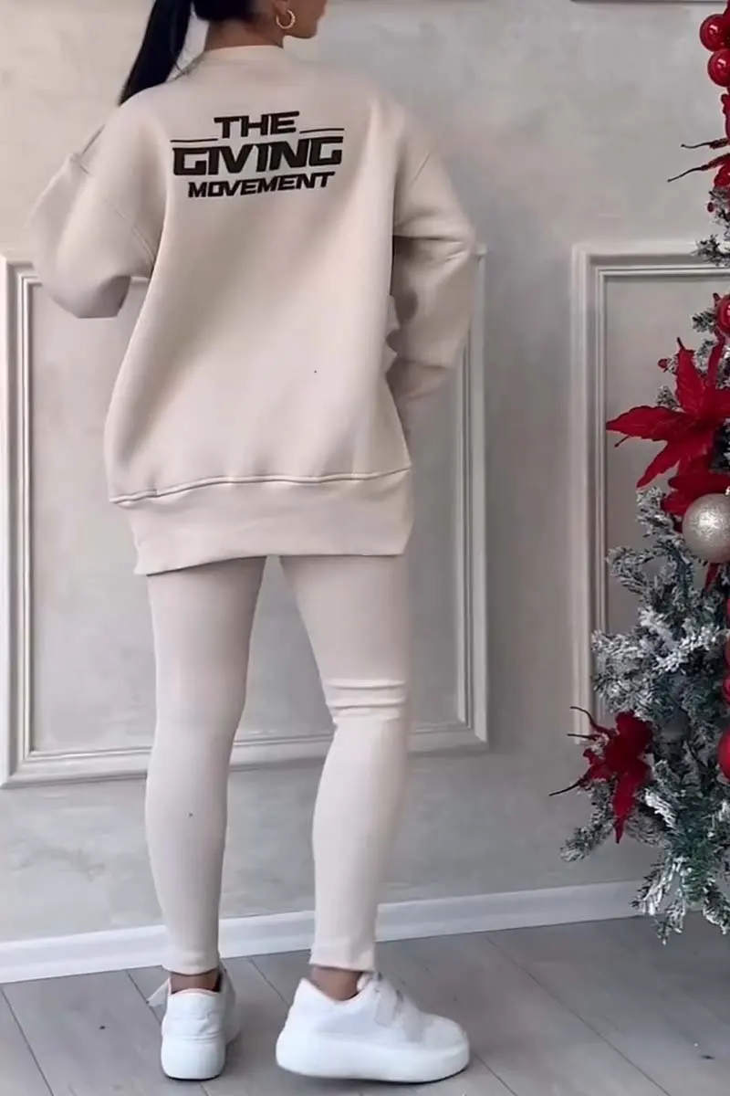 Level up cozy-chic style with this autumn & winter black 2-piece set featuring an irregular hem, round-neck sweatshirt with letter patch detail and matching stretch leggings. Soft, comfy, and easy to style—pair with sneakers or boots for errands, travel, or lounging. Flattering slim fit, side slits for movement, and ankle-slit leggings for a sleek silhouette. Your go-to everyday set for cold-weather streetwear.