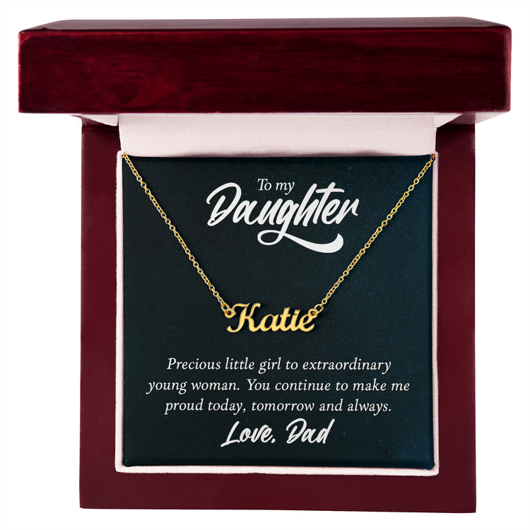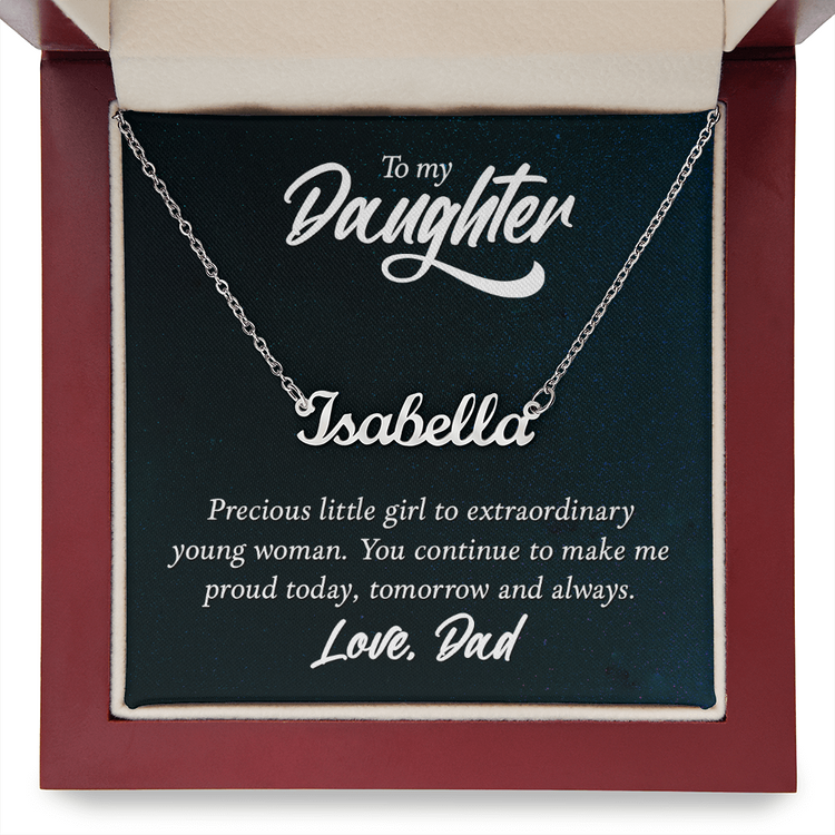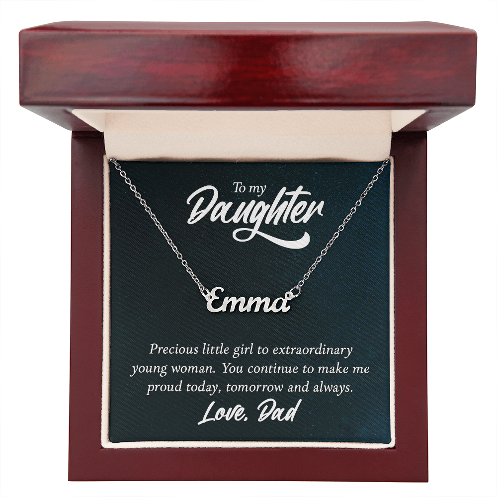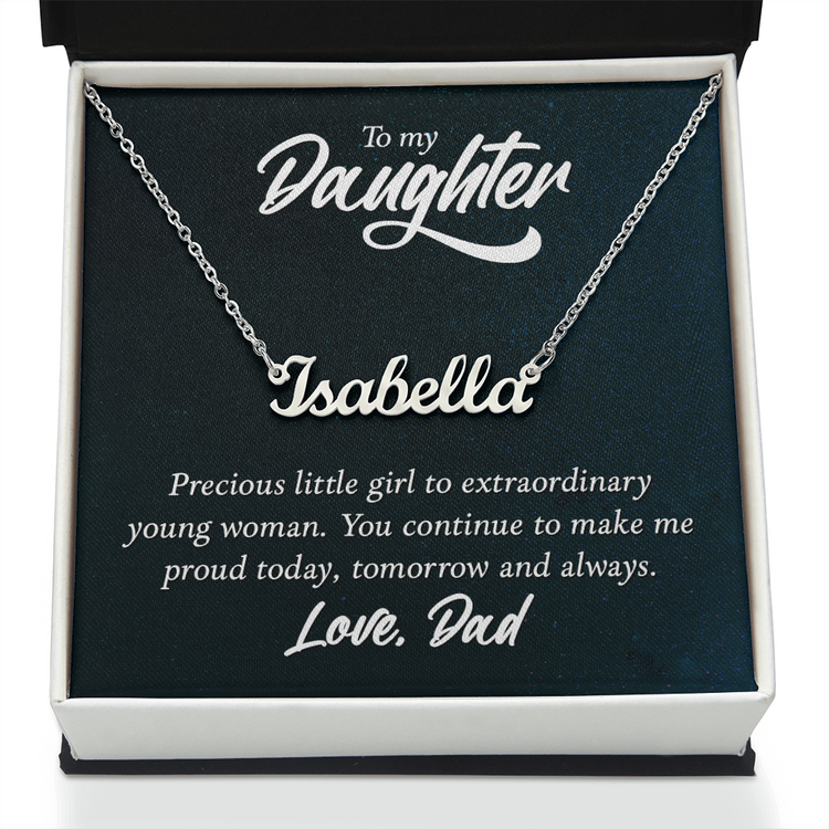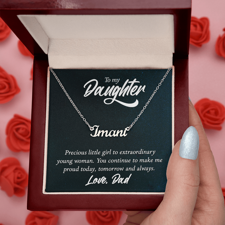 Celebrate her with a Custom Name Necklace for Daughter from Dad, MADE IN THE USA. This elegant script pendant is personalized with any name or word (up to 11 characters) and hangs from an adjustable 16–18" cable chain with a secure 9mm lobster clasp. Choose a polished stainless steel or luxurious 18K yellow gold finish. Beautifully gift-boxed (upgrade to a mahogany LED box for extra sparkle), it’s a meaningful birthday, graduation, Christmas, or just-because gift she’ll cherish every day. A trendy, versatile accessory that keeps your message close to her heart.