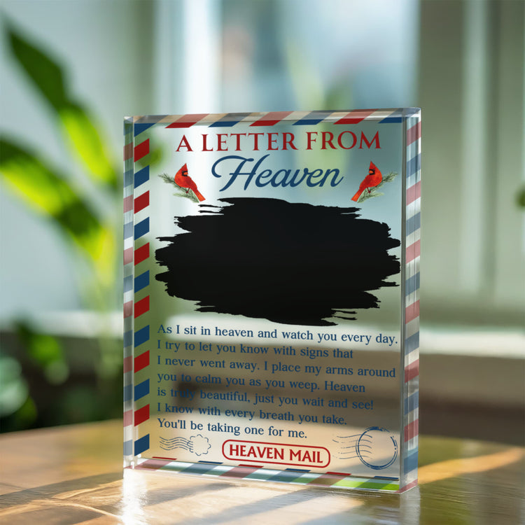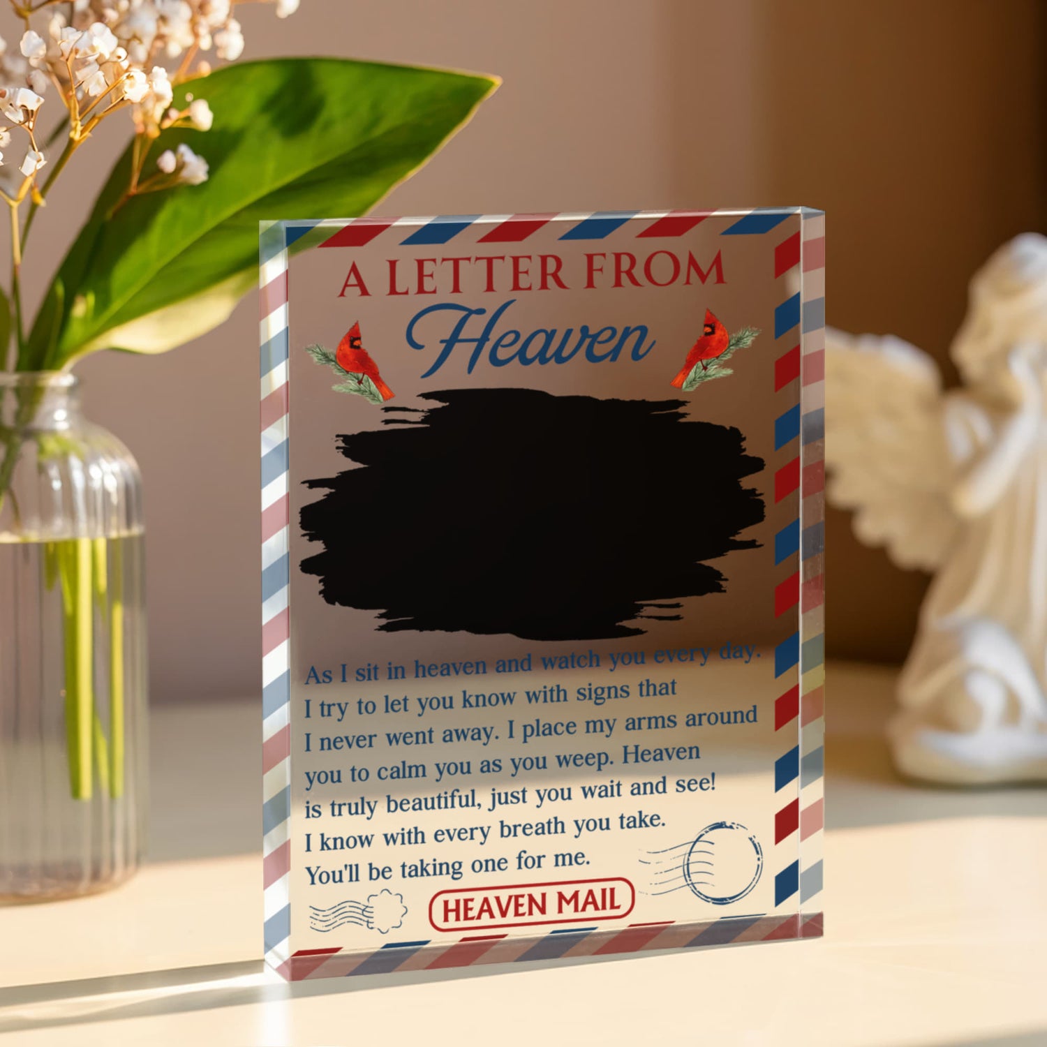 Touching memorial acrylic block featuring a custom photo, cardinal birds, and a comforting poem: "A Letter From Heaven." Beautiful, sentimental keepsake gift for loss.
