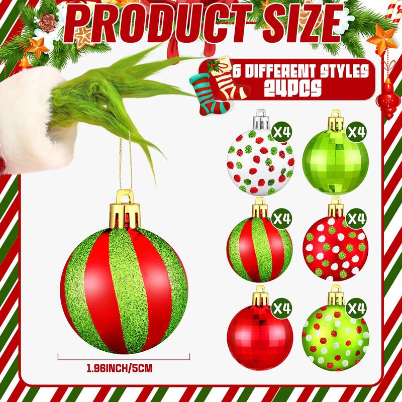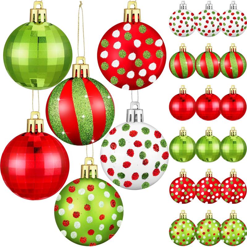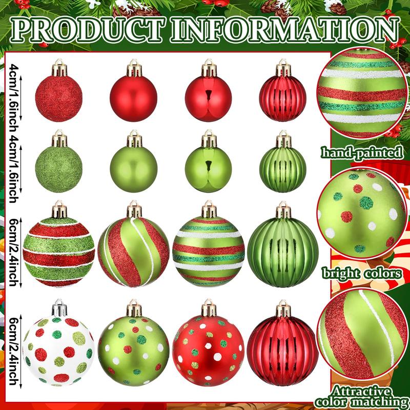 Add festive charm to your tree with the Christmas Ball Ornaments Set, featuring a mix of funny lime green monster, classic red bow, and glittering shatterproof balls in multiple sizes and styles. Perfect for Xmas trees, home décor, holiday parties, and gift-giving.