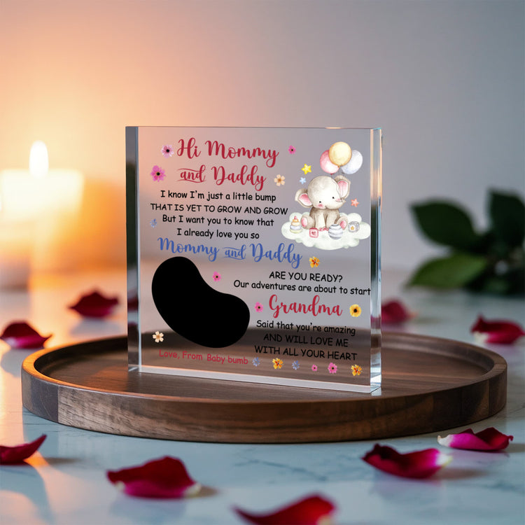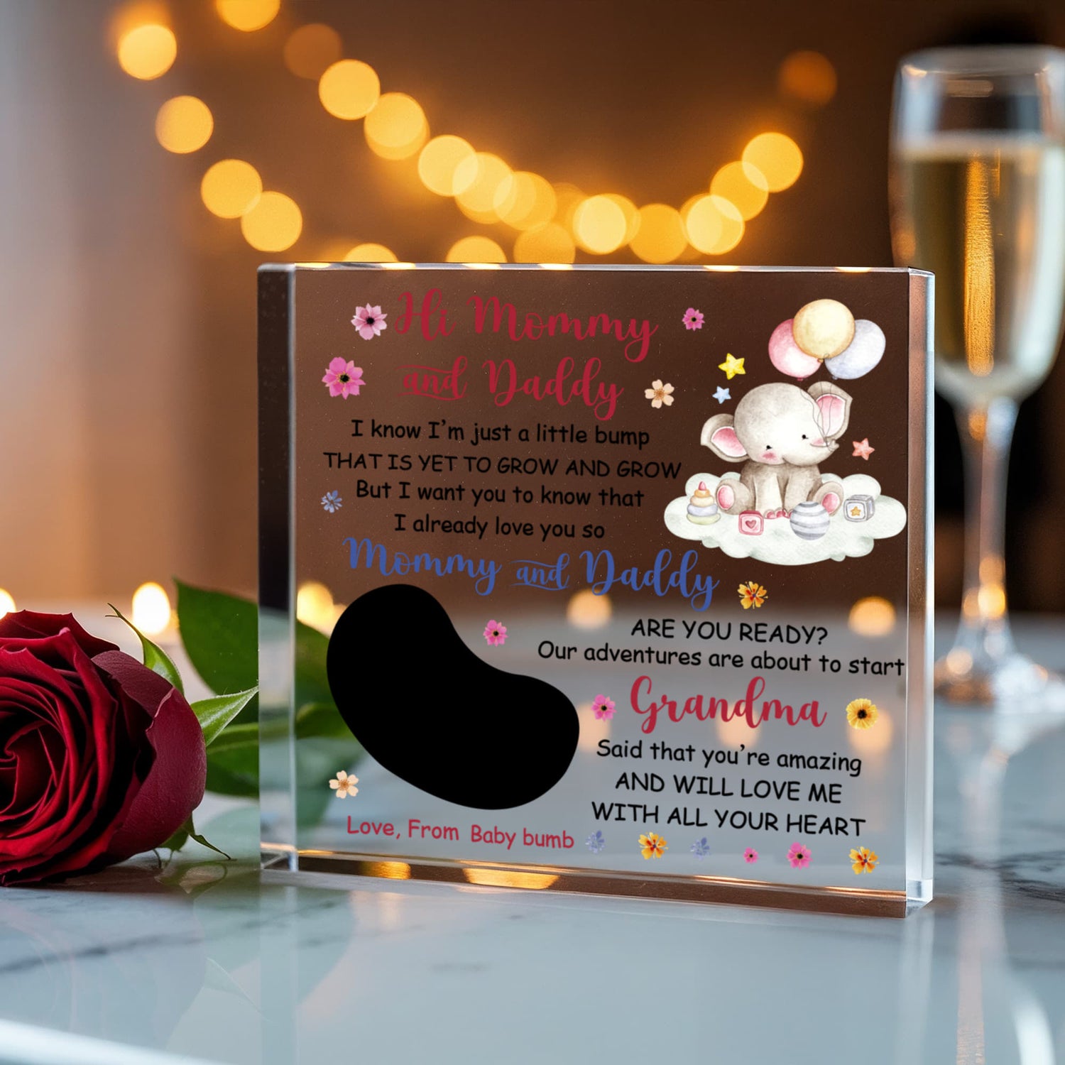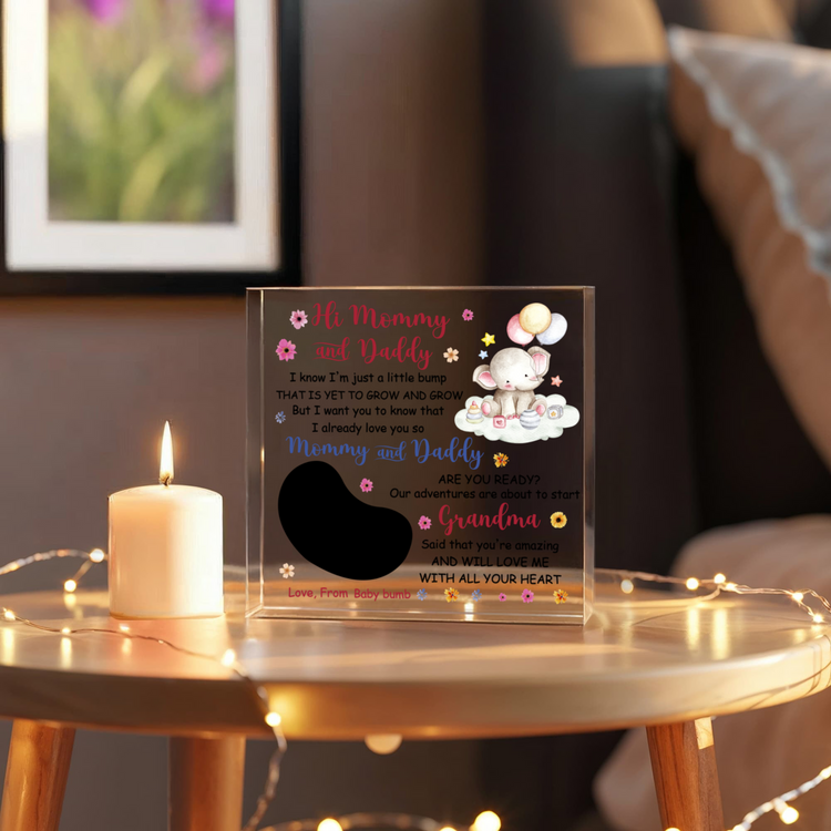 The acrylic block includes a touching poem from the baby to Mommy and Daddy, paired with an ultrasound photo and a cute baby elephant illustration surrounded by flowers and pastel balloons. It’s the perfect sentimental gift to celebrate the start of a new journey together as parents.