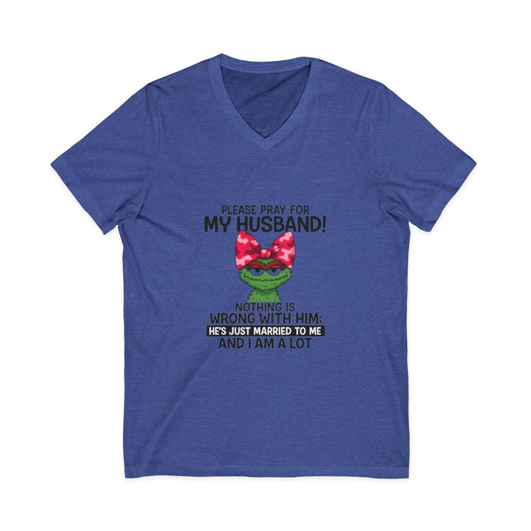 Hilarious V-neck T-shirt for wives! Features a funny Grinch-style character and the quote "Pray For My Husband! Nothing Is Wrong With Him: He's Just Married To Me."
