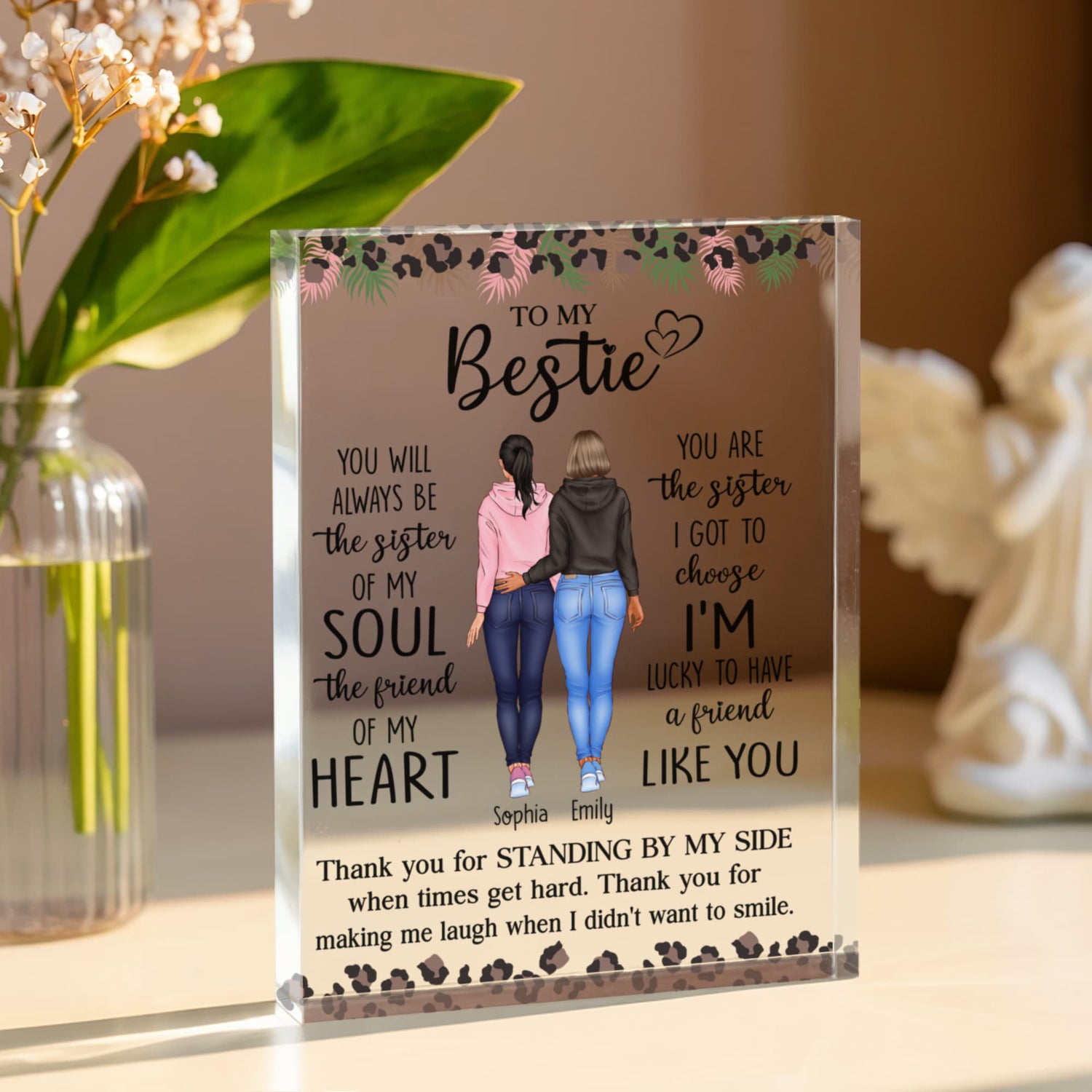 Heartfelt "To My Bestie" acrylic block. Features quote "Sister of My Soul," personalized names, and trendy leopard print border. Perfect birthday/appreciation gift for a friend.